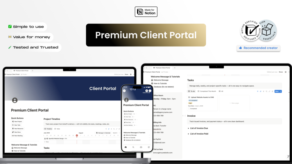 This Notion-based Premium Client Portal gives your clients a clean, organized, and professional space to track every detail of their project - from kickoff to completion.