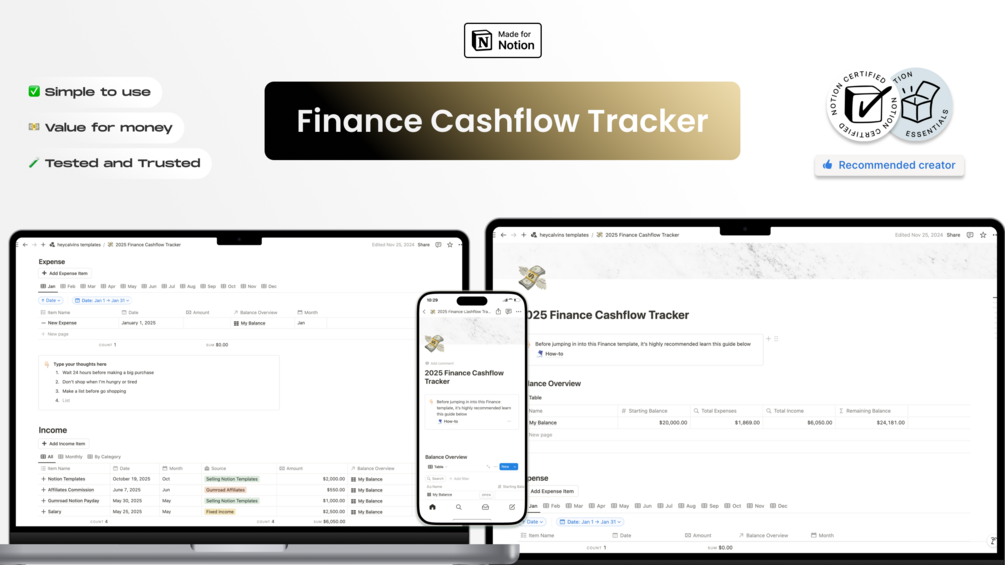This Finance Cashflow Tracker offers ways to track and navigate your finances through features such as a monthly expense tracker, simple income tracker