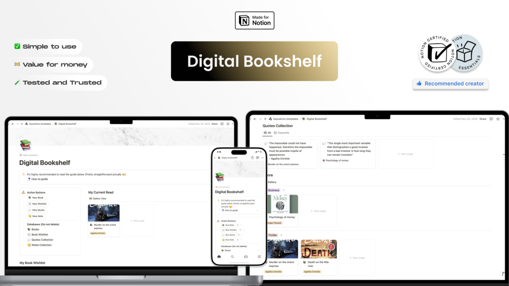 This pre-made Digital Bookshelf Notion template is designed to help you organize and indirectly boosts your reading habit