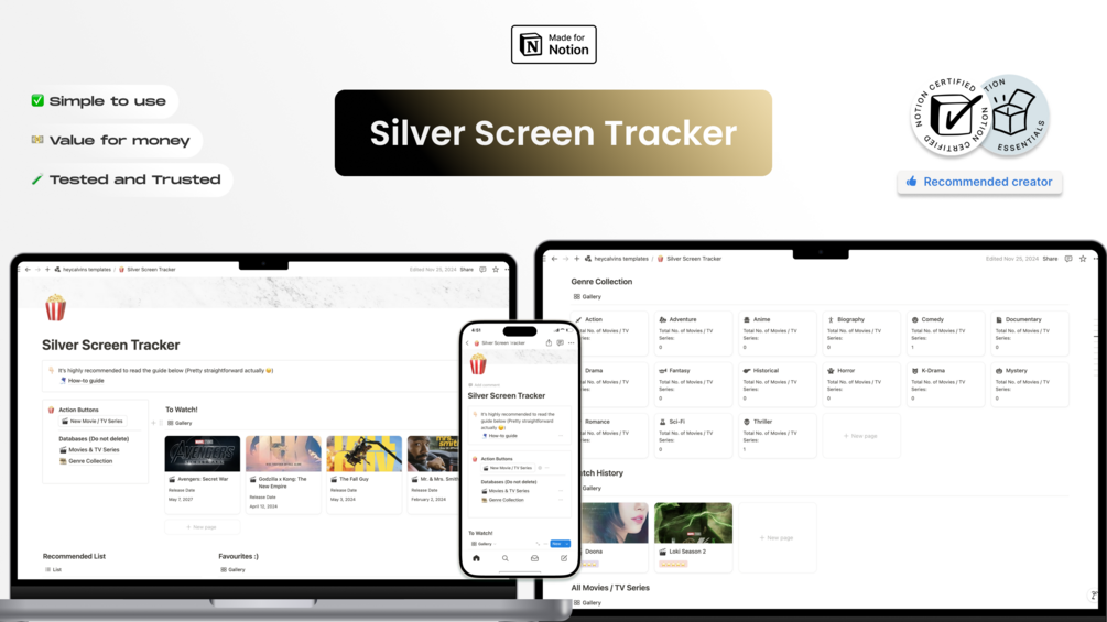 This pre-made Notion Silver Screen Tracker template is designed to help you organize the movies & films you wanna watch and have watched for your satisfaction